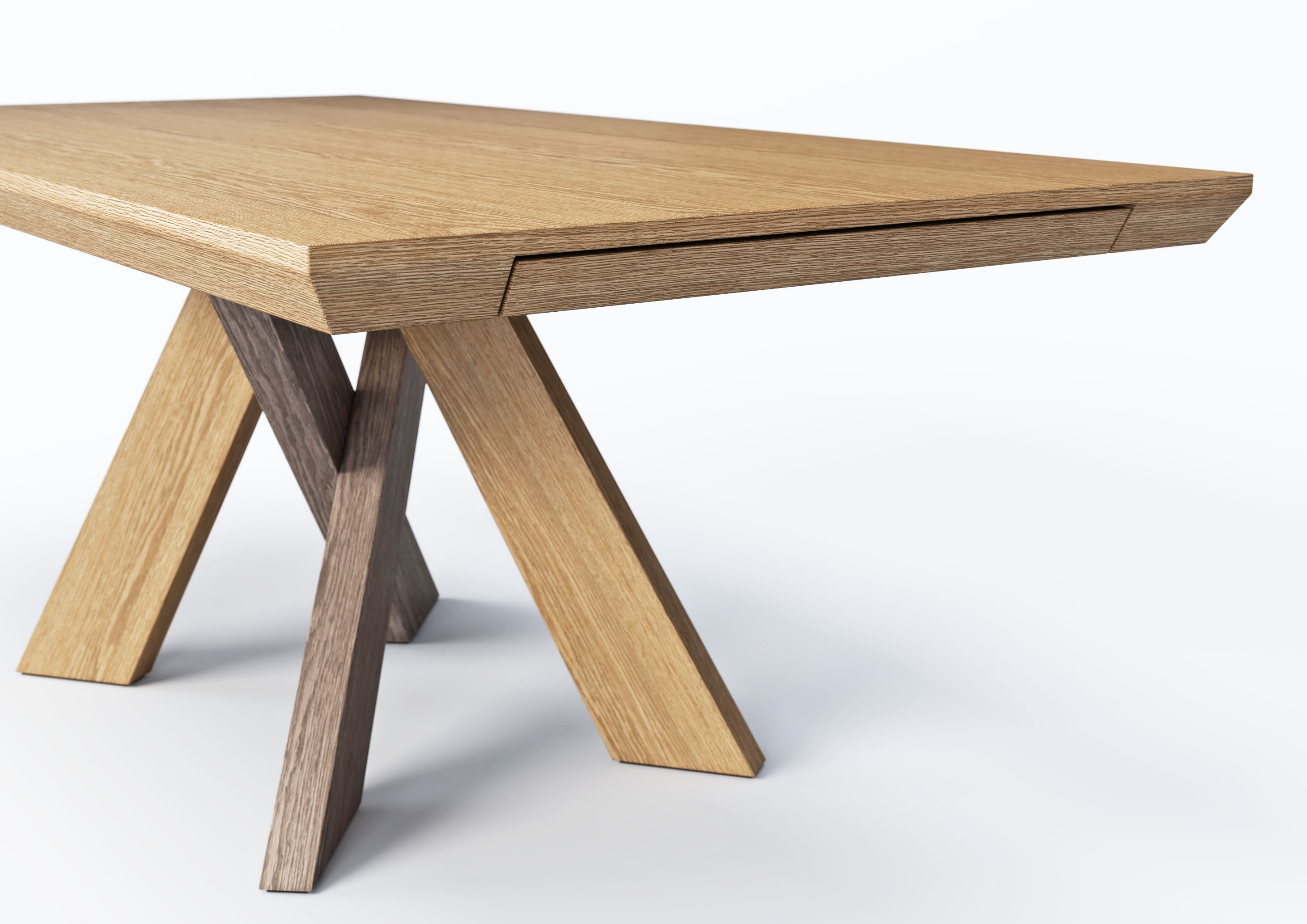 Περιγραφή Μια ιδιαίτερη πρόταση που κεντρίζει το ενδιαφέρον κυρίως λόγω του εντυπωσιακού σχήματος που δημιουργούν τα πόδια της. Οι προεκτάσεις της ενσωματώνονται κομψά στο κύριο σώμα της τραπεζαρίας και αποθηκεύονται μέσα σε αυτό.
