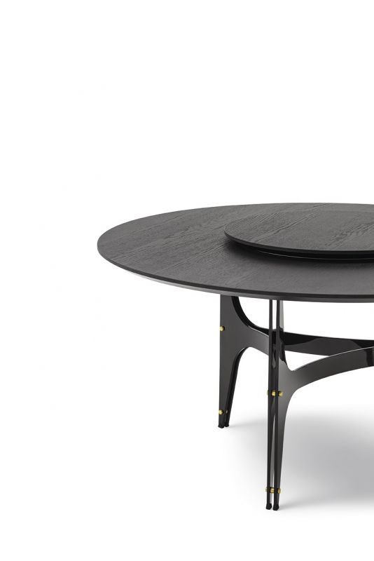 Fixed round table, lacquered metal frame and decorative details. Standard top in Veneer wood, Glossy glass, matt Velvet matt anti-scratch lacquered glass or ring top with central turntable in Glossy glass, matt Velvet matt anti-scratch lacquered glass or SuperMarble.